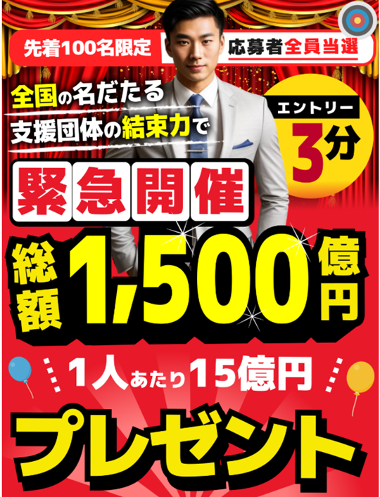 「1500億円プレゼント企画」は詐欺? 専門家が運営元不明の高額当選オファーを徹底検証。登録検証で判明した手数料要求の手口や口コミの真偽を公開。当選金詐欺の危険性からあなたの財産を守るための具体的な対策を解説します。