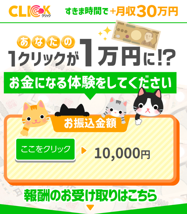 「CLICK」副業紹介サービスの危険性を徹底検証。1クリック1万円の謳い文句の真偽、運営会社「株式会社ワイズ」の実態を調査。消費者庁注意喚起の詐欺的副業に酷似した案件の全容と、利用者が負うリスクを解説します。
