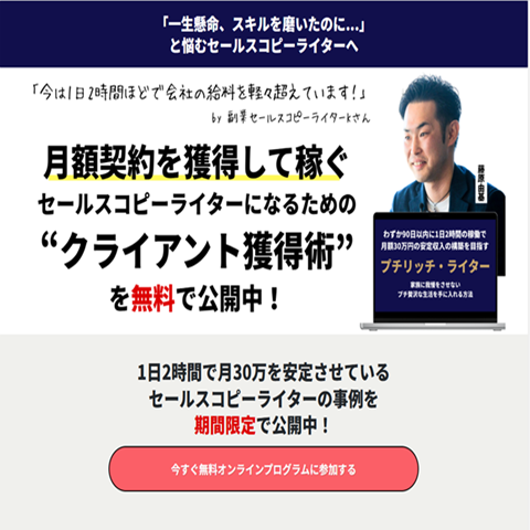 藤原由基氏の「プチリッチ・ライター養成プログラム」の評判と実態を徹底検証。1日2時間で月収30万円は本当か?特商法表記での電話番号未掲載や株式会社FJCの法人登録に関する懸念、高額な参加費のリスクを詳しく解説します。怪しい副業に騙されないためのチェックポイントを網羅した、ライター必見の調査報告です。