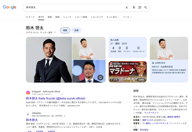 情報提供者の氏名「鈴木啓太」は、サッカー元日本代表として著名な人物と同姓同名です。セールスページでは、この人物が「投資業界でかなり有名」であると強くアピールされていますが、ネット検索による調査を試みると、結果はほぼ元サッカー選手の鈴木啓太氏一色となります。
