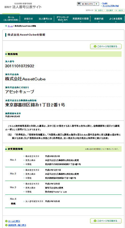 販売会社である株式会社Asset Cube(アセットキューブ)の法人登録は確認できました。