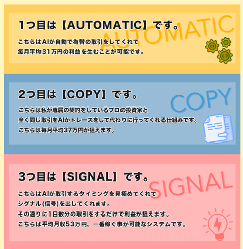 - AUTOMATIC(自動システム):月平均31万円を稼げると謳う自動売買システム。