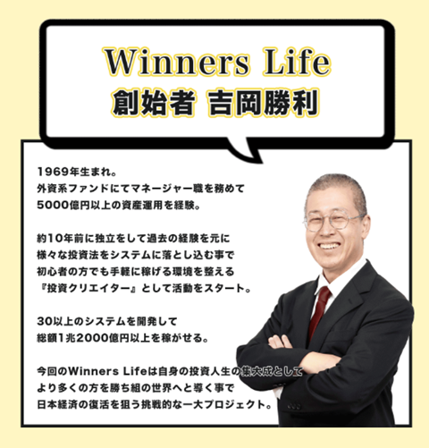 公式サイトでは、吉岡勝利氏について「外資系ファンドのマネージャー」「5,000億円の資産運用経験」「総額1兆2,000億円を稼がせた」といった輝かしい経歴が記載されています。