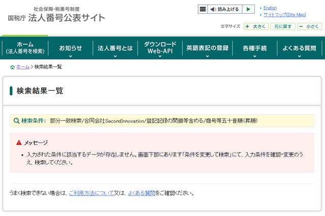 国税庁の法人番号公表サイトで「合同会社SecondInnovation」を調査したところ、法人情報は見当たりませんでした。