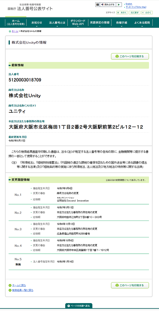 しかし、登記情報をさらに追跡した結果、社名が既に「株式会社Unity」に変更されていた事実が判明したのです。