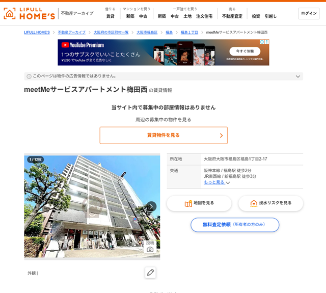記載された住所(大阪府大阪市福島区福島1丁目2-17-1階)を調査したところ、「meetMeサービスアパートメント梅田西」という賃貸物件、またはその1階のテナント部分であることが判明しました。