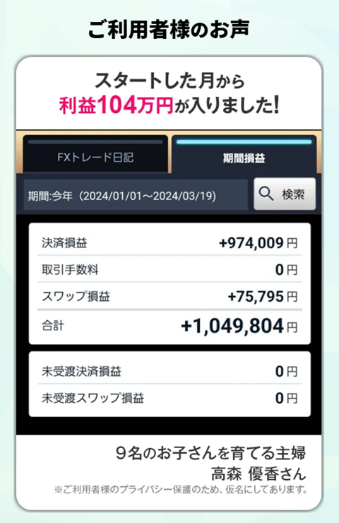 セールスページでは、ツールの収益性を示すために「ご利用者の声」として、多額の利益が計上された取引履歴の画像などが掲載されています。