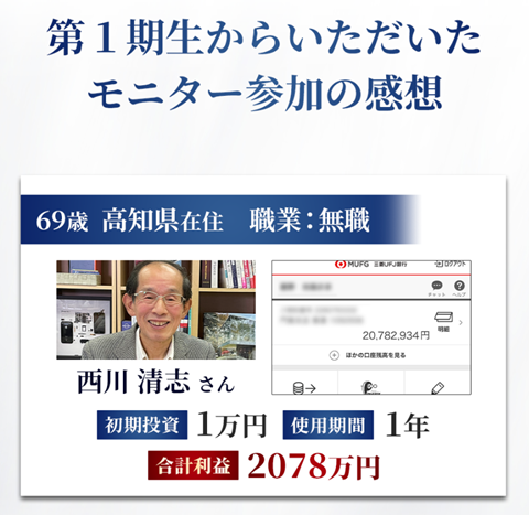 セールスページには、システムによる導入実績やモニター参加の感想が掲載されています。