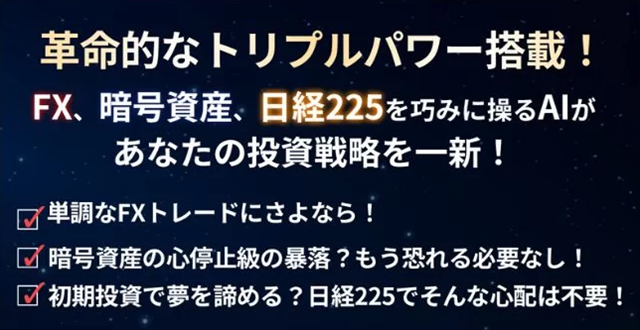 セールスページでは「何もせずに今日は1万円、明日から3万円を稼ぐ」「3つの投資メゾットが融合した世界初の完全自動システム」といった魅力的な謳い文句が並び、高い収益性を保証するかのような表現が多用されています。