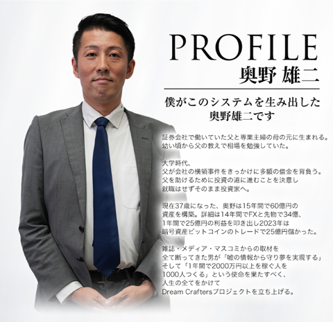 今回、インターネット上で展開されている副業・投資案件「Dream Crafters(ドリームクラフターズ)」について、その実態と信頼性を詳細に調査しました。情報提供者は奥野雄二氏とされています。