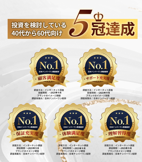 セールスページでは、「投資を検討している40代から60代向け5冠達成」として、顧客満足度No.1、サポート充実度No.1など、5つのNo.1実績が強調されています。