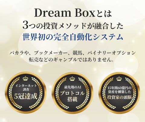 無料登録後、Dream Craftersが利用する「3つの投資メゾット」がFX、暗号資産、日経225であることが判明しました。これらの金融商品を利用し、資産を増やし続ける「世界初の自動収益システム」を「Dream Box」と称しています。