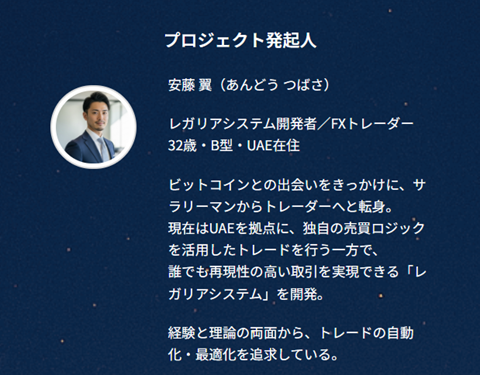 - 公称プロフィール: 32歳、B型、UAE在住。ビットコインとの出会いをきっかけにトレーダーに転身し、独自の売買ロジックを活用したシステムを開発した。