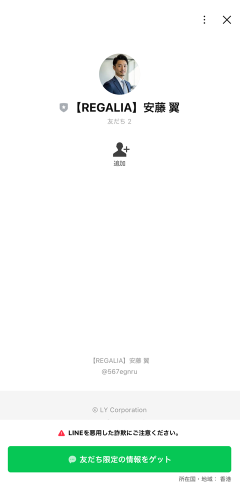 - 所在国が「香港」である事実: LINEアカウントの所在国が「香港」と表示されていました。販売元が日本の住所(バーチャルオフィス)を使用し、情報提供者がUAE在住を公称する中で、運営の実態が香港にある可能性は、事業の実態と所在地の複雑性を示しており、信頼感を損ないます。