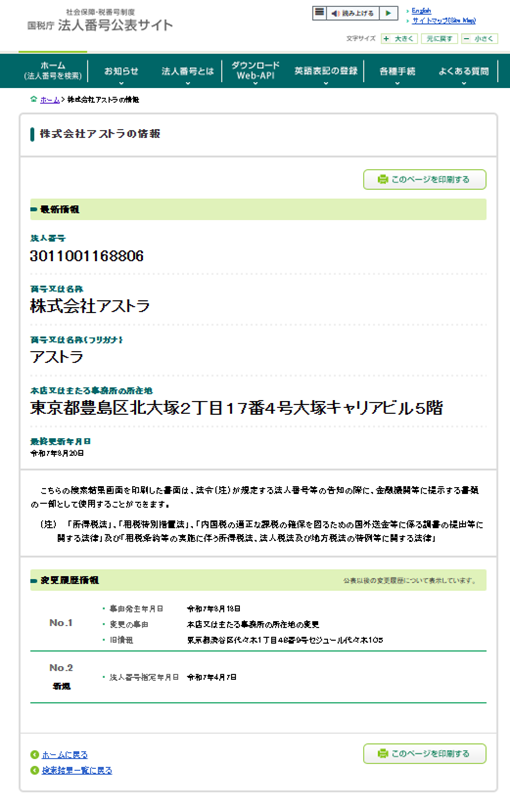 記載された情報について検証した結果、株式会社アストラが法人として存在すること、および所在地である「大塚キャリアビル」という賃貸オフィスが存在することは確認できました。特商法表記の住所と法人登録情報にも相違はありませんでした。