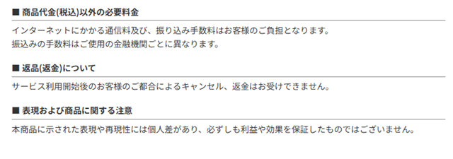 特商法表記に「返金や返品については不可」と明記されている点も大きなリスク要因です。