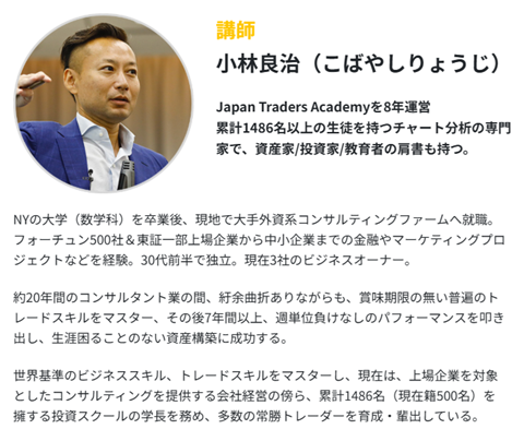 JTAの学長を務め、指導の中心となっているのは、小林良治(こばやし よしはる)氏です。同氏は自らを「現役プロトレーダー」と称し、その実績をもって受講生を指導する立場にあります。