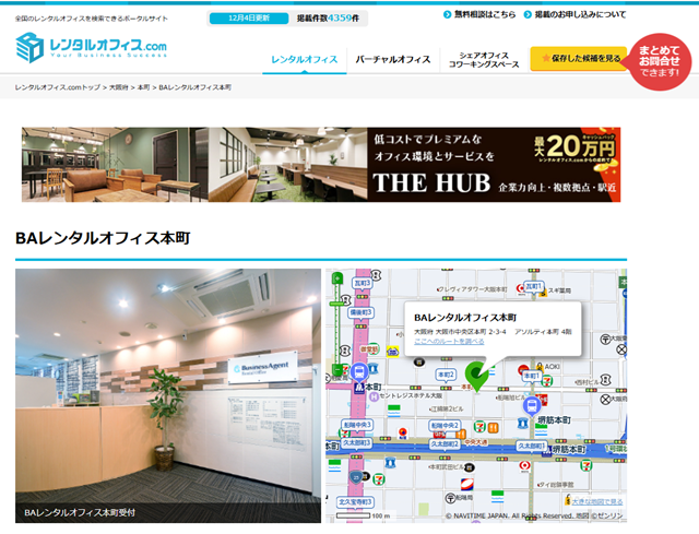 特商法に記載された所在地は「〒541-0053 大阪市中央区本町2-3-4」です。この住所を調査したところ、法人登録自体は確認済ですが、この場所はBAレンタルオフィス本町であることが判明しました。所在地は特商法表記と一致してはいるものの、実体のある事業所ではなく、バーチャルオフィス(レンタルオフィス)を利用している可能性が高い点は、高額なコンサルティングを提供する企業としては透明性が低いと言え、信頼性を損なう要因となります。