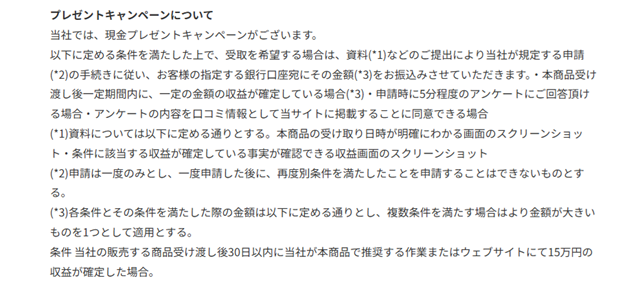 条件: 当社の販売する商品受け渡し後30日以内に当社が本商品で推奨する作業またはウェブサイトにて15万円の収益が確定した場合