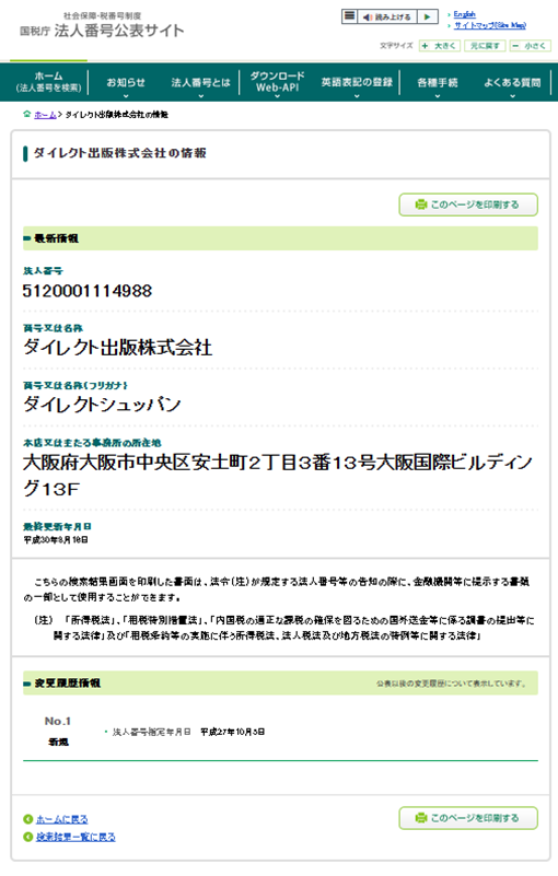 販売業者はダイレクト出版株式会社であり、法人登録は確認済みです。販売責任者は小川忠洋氏。所在地は「〒541-0052 大阪府大阪市中央区安土町 2 丁目 3-13 大阪国際ビルディング 13F」と記載されており、これは賃貸オフィスビルの一室ですが、登記情報と照合した結果、所在地に関する相違はありませんでした。