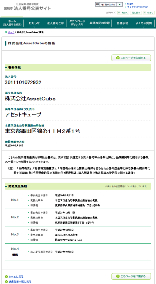 具体的には、平成27年12月8日に商号(会社名)が変更されており、その旧情報は「株式会社Trader’s Lab」でした。その直後の平成27年12月11日には、本店(所在地)が「東京都新宿区西新宿6丁目15番1号」から変更されています。さらに、平成30年8月21日にも本店所在地が「東京都千代田区神田神保町1丁目5番1号」から変更されていることが確認されています。