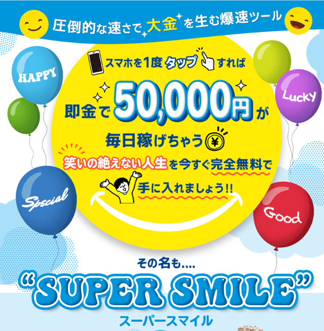「スーパースマイル(SUPER SMILE)」は本当に稼げる?「毎日5万円」の謳い文句を徹底検証!特商法・口コミ調査の結果、詐欺まがいのリスト取りが目的と判明。登録しても稼げない理由と、過去の悪質案件との繋がりを専門家が詳細に暴露します。登録は絶対にお控えください!