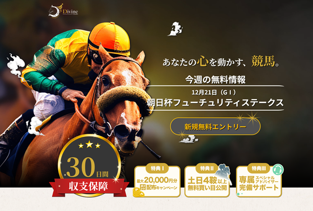 競馬予想サイト「Divine(ディバイン)」の評判・口コミを徹底検証。30日収支保証や的中実績の信憑性、運営事務局の実態をプロの視点で鋭く分析します。「当たらない」「詐欺」といった不安な噂の真相は?登録前に知るべきリスクと外部評価を網羅。悪質サイトに騙されないための正しい知識を紳士的に解説します。